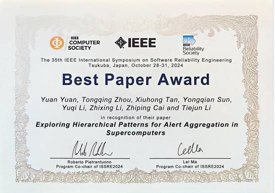 此外,孙永谦老师与国防科技大学、国家超级计算机天津中心合作的论文“Exploring Hierarchical Patterns for Alert Aggregation in Supercomputers”荣获Best Paper Award。