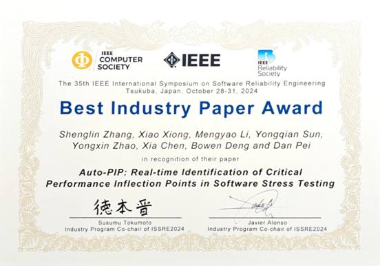 (张圣林 孙永谦)2024年10月28日至10月31日,第35届国际软件可靠性工程旗舰会议--IEEE International Symposium on Software Reliability Engineering(ISSRE'24,CCF推荐软件工程领域B类国际会议)在日本筑波市成功举办。公司Playace平台官网入口张圣林老师和孙永谦老师参会,在会上报告了5篇录用论文的研究内容,并包揽该会议的两项最佳论文奖——最佳论文奖(Best Paper Award)和最佳工业论文奖(Best Industry Paper Award)。其中,张圣林老师、孙永谦老师与华为云计算公司、清华大学等单位合作的论文“Auto-PIP: Real-time Identification of Critical Performance Inflection Points in Software Stress Testing”荣获Best Industry Paper Award,该项工作受“CCF-华为胡杨林基金”资助。