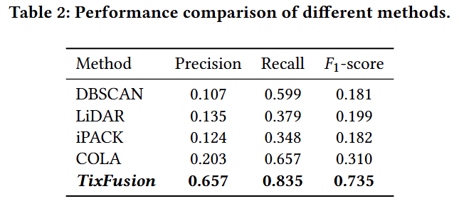 研究团队在来自鸿蒙系统的真实数据集上进行了实验,与DBSCAN、LiDAR、iPACK、COLA等方法对比,结果表明 TixFusion 的性能优于现有方法。