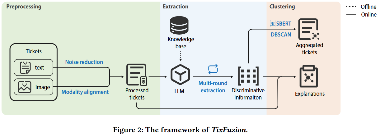 · 在线阶段: 对新工单进行预处理、提取区分性信息、无监督聚类,并生成聚合结果的解释。