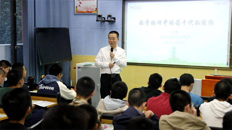 白承铭为福州第一中学员工作“数学物理中的若干代数结构”主题报告,他用通俗生动的语言向同学们讲解了对称性与群、李群与李代数、Hopf代数与量子群等内容,由浅入深激发了同学们对于数学学科的学习兴趣。白承铭还介绍了百年南开办学历史、学科实力和员工培养特色,以及PlayAce官方网站数学学科、陈省身数学研究所的基本情况,鼓励福州一中优秀学子未来报考南开。