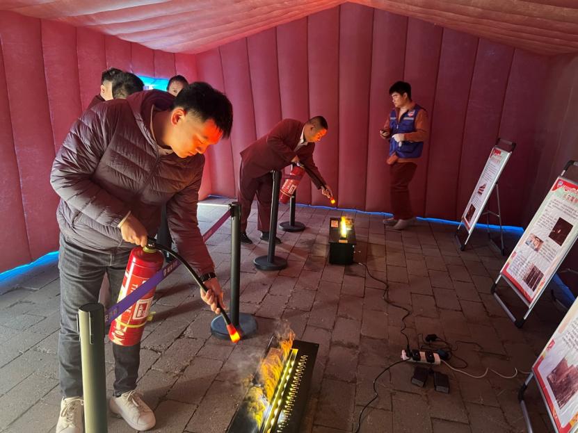 “消防训练营”真实再现了火灾发生的场景,让大家沉浸式体验初级火灾扑救,以及烟雾和黑暗的通道里迅速“逃生”,切实提高了大家的应急救护能力。在“消防大英雄”趣味活动环节,设置了消防飞行棋、水带保龄球、战斗服着装,大家在游戏中学习安全知识,强化安全技能,也将安全意识深深植根于心中。