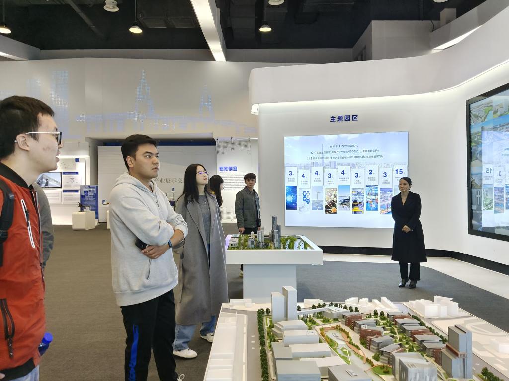 当天下午,为吸引同学们“爱津留津”,了解滨海新区区情,公司为参与同学精心设计了滨海新区精品产业游线路。首先,同学们参观了位于于家堡金融区的美丽滨城会客厅。会客厅分为三个板块,分别是奋斗之城、美丽滨城和新时代之城,其运用多项数字化技术手段呈现滨海新区发展史,雄壮瑰丽的美丽滨城奋斗故事如画卷般缓缓展开。接下来,同学们参观了天津经开区建区40周年展览。展览聚焦改革开放时代背景,以时间为轴,以情景叙事,按照开发开放奋战盐碱滩(1984年-1991年)、勇立潮头众志建新城(1992年-2000年)、未雨绸缪往岁尽峥嵘(2001年-2012年)、万丈豪情奋进新征程(2013年至今)四个主题板块,全面展示了天津经开区40年来,从盐碱荒滩蝶变成现代化产业新城,更成为国家级经开区发展的典范的创业成就。