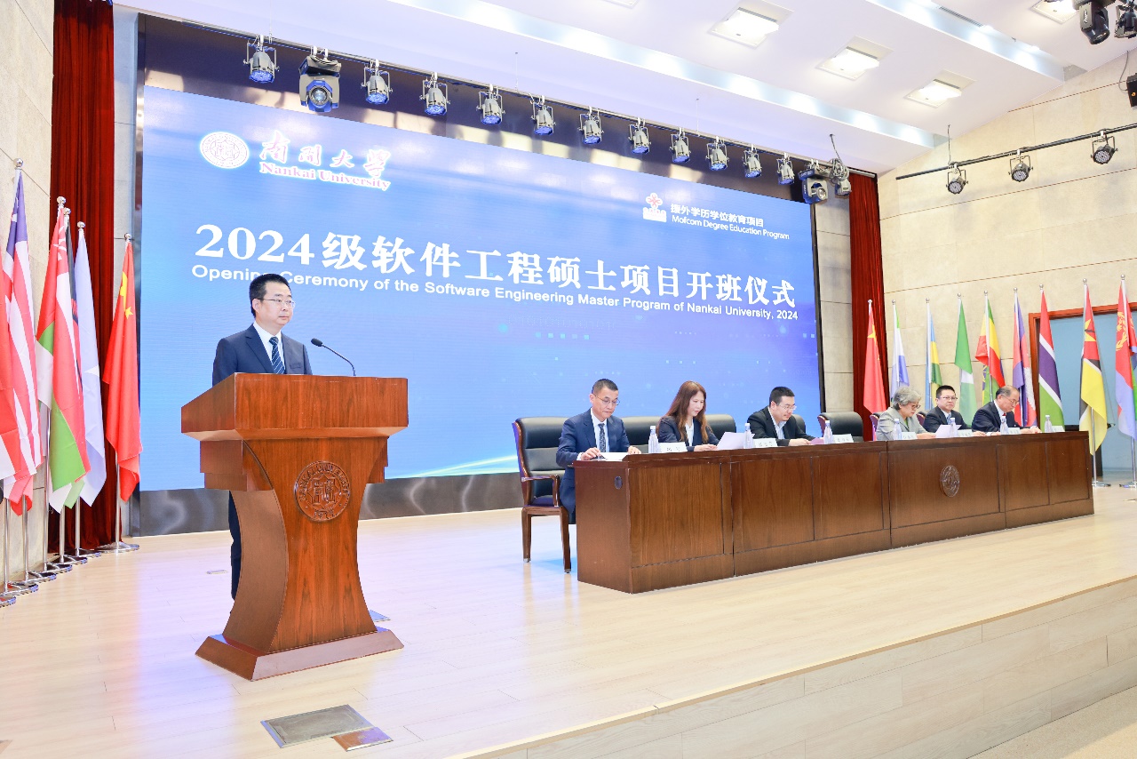 白承铭董事长在致辞中对各位学员成为南开人表示热烈欢迎,并介绍了南开的历史、现状、文化传统和国际交流等方面的情况。白承铭说,公司高度重视本次援外硕士项目,希望各位学员不仅在南开学到技术、知识和经验,也能收获中国人民和南开师生的友好感情,学成回国后成为所在国互联网和软件工程领域的生力军,更成为推动国际间友好交流的使者,为各国青年来华学习和交流搭建起友谊的桥梁。