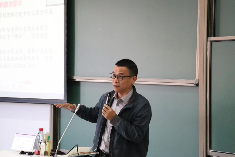 肖光文教授结合会议提出的“明体达用、体用贯通”,阐明习近平文化思想既有思想理论层面的认识论也有实践操作层面的方法论,既有宏观层面的规律性认识也有具体层面的实践路径,实现了体与用、理论与实践、认识论与方法论的辩证统一。肖光文教授还建议师生要深刻把握习近平文化思想的精髓要义,深刻理解习近平文化思想形成的时代背景和重大意义,坚守好马克思主义“魂脉”和中华优秀传统文化“根脉”,坚定文化自信、秉持开放包容、坚持守正创新,为师生深入学习领会习近平文化思想并指导实践提出了具体的指导和建议。